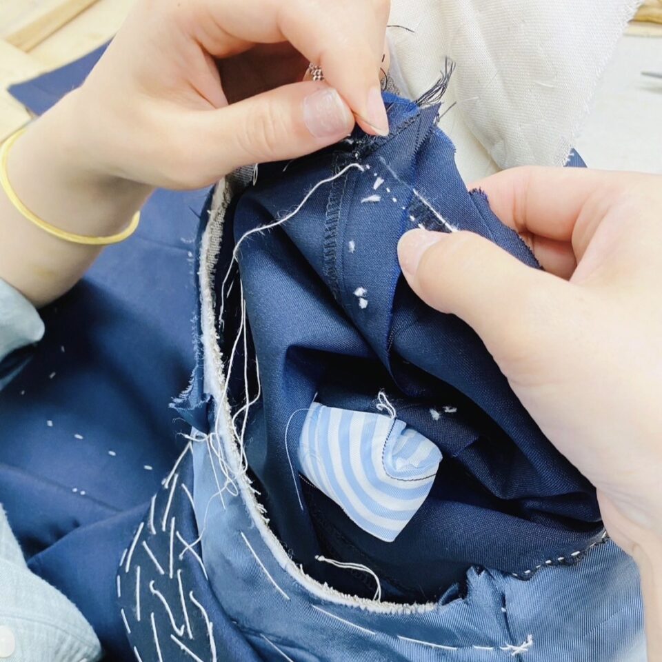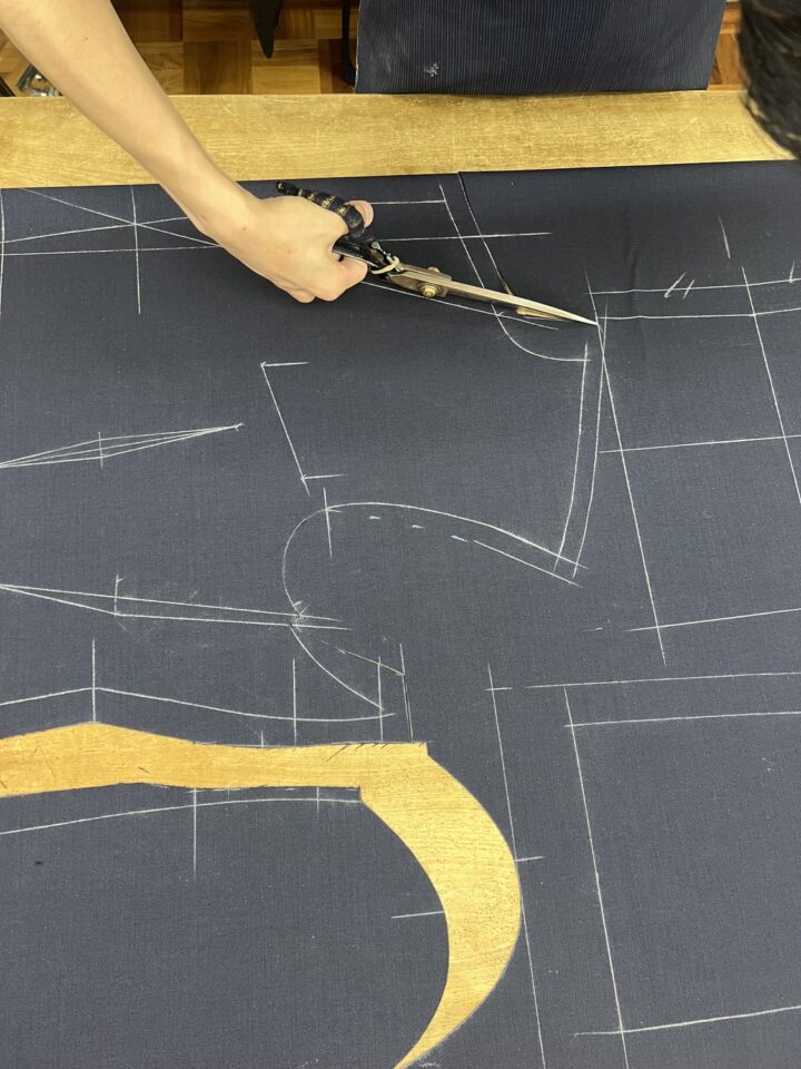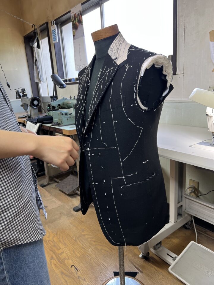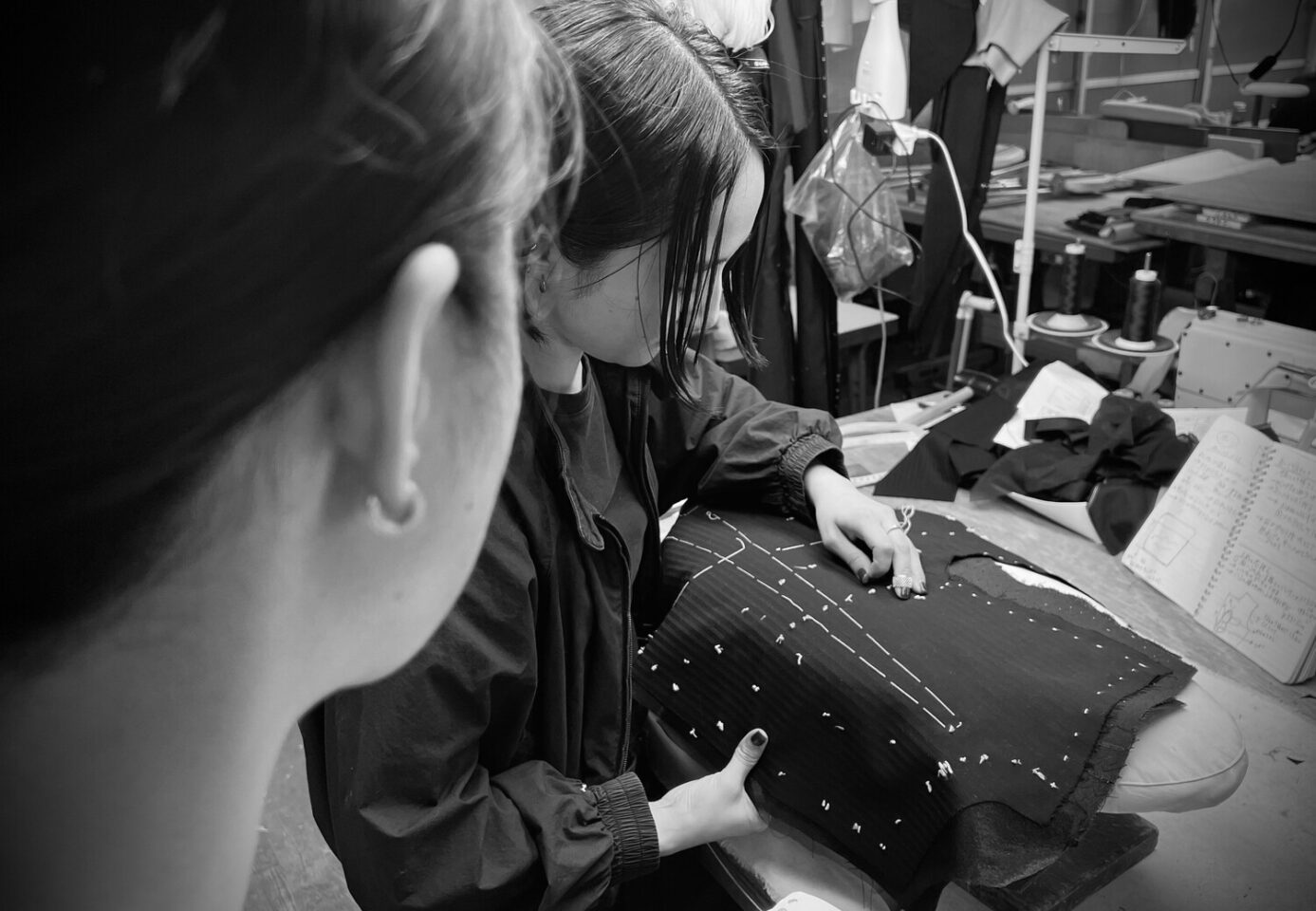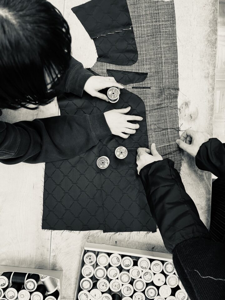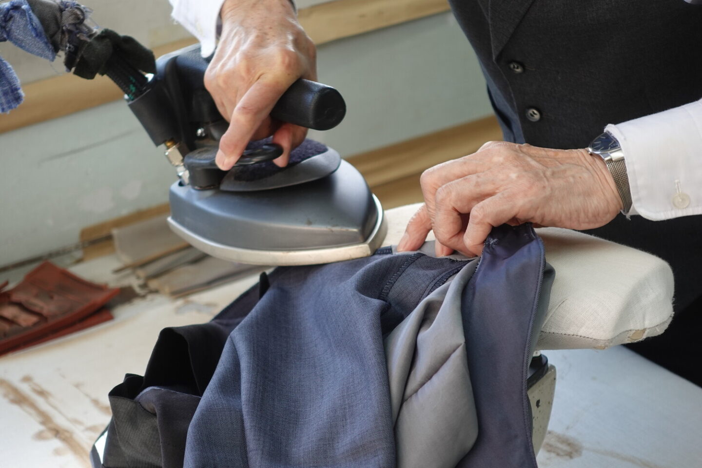 静かな時間の流れる縫製工房。手縫いの針が布をすべる音、アイロンの蒸気が立ちのぼる気配。時折聞こえる職人同士の会話が、空間にやさしく、時には楽しくリズムを添えます。限られた時間の中でも、それぞれが自由に、そして誠実に服づくりに向き合う姿。ここには、技術を惜しみなく伝え合う文化と、一着に込める思いが静かに息づいています。伝統と柔軟さが共存するこの場所で、服はただ縫われるのではなく、育まれていきます。
