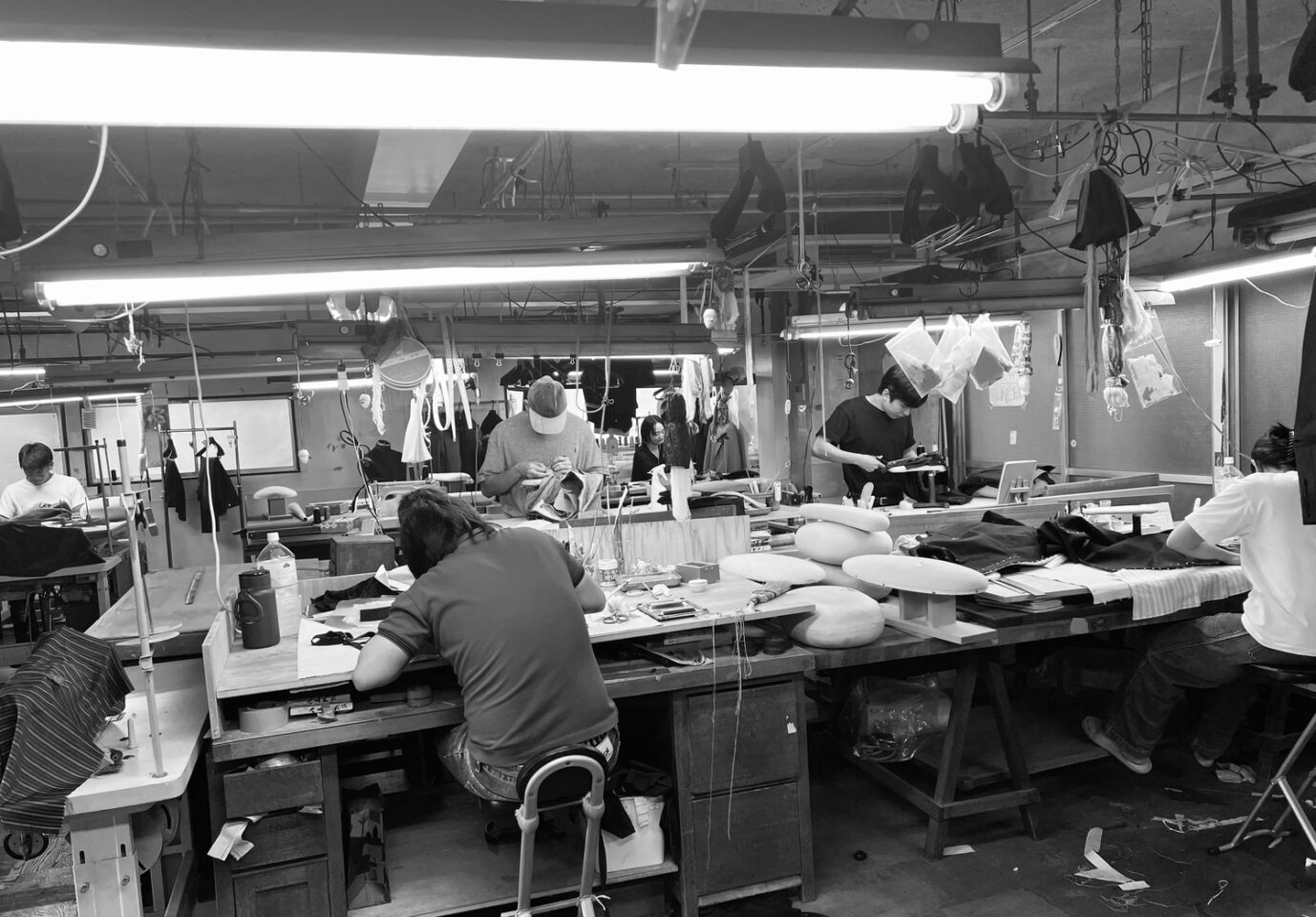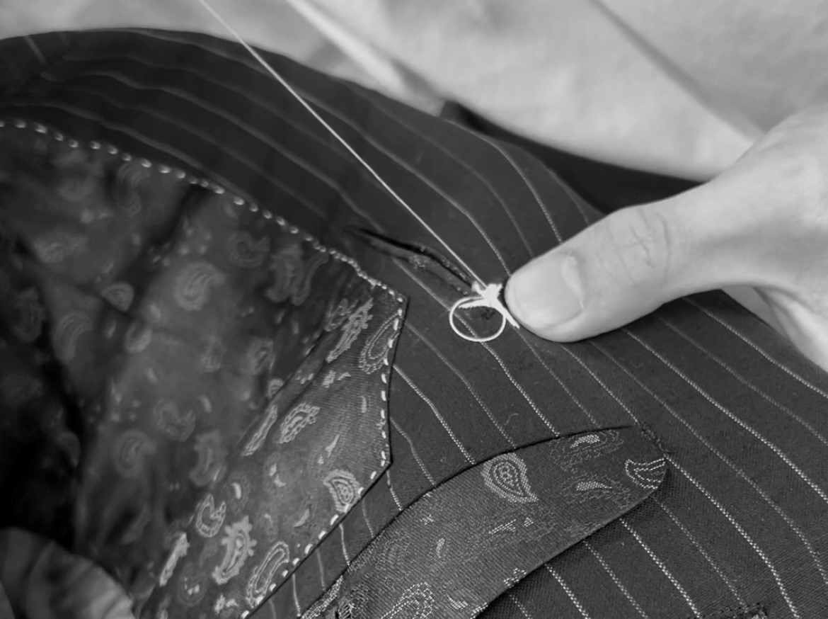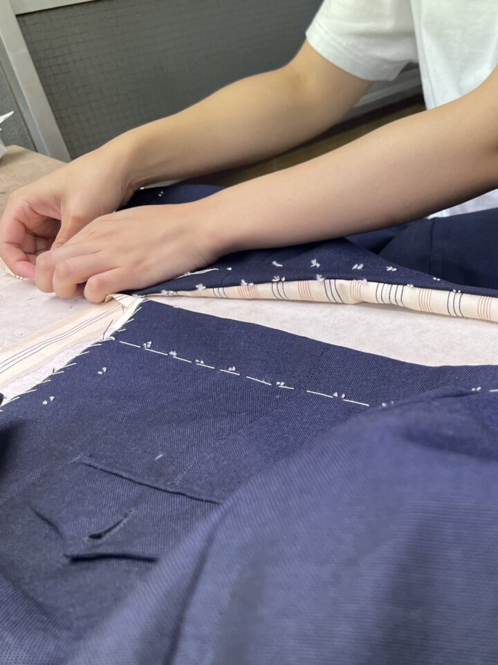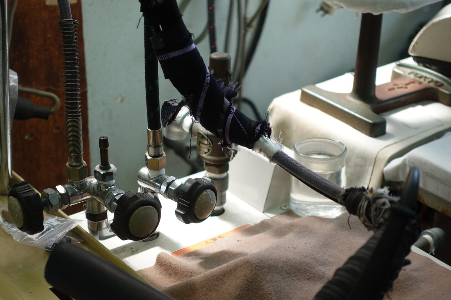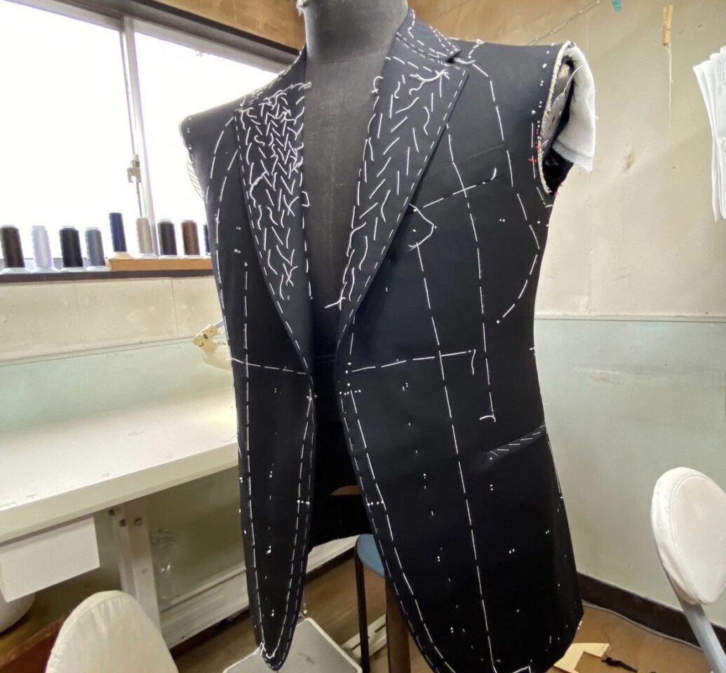 静かな時間の流れる縫製工房。手縫いの針が布をすべる音、アイロンの蒸気が立ちのぼる気配。時折聞こえる職人同士の会話が、空間にやさしく、時には楽しくリズムを添えます。限られた時間の中でも、それぞれが自由に、そして誠実に服づくりに向き合う姿。ここには、技術を惜しみなく伝え合う文化と、一着に込める思いが静かに息づいています。伝統と柔軟さが共存するこの場所で、服はただ縫われるのではなく、育まれていきます。
